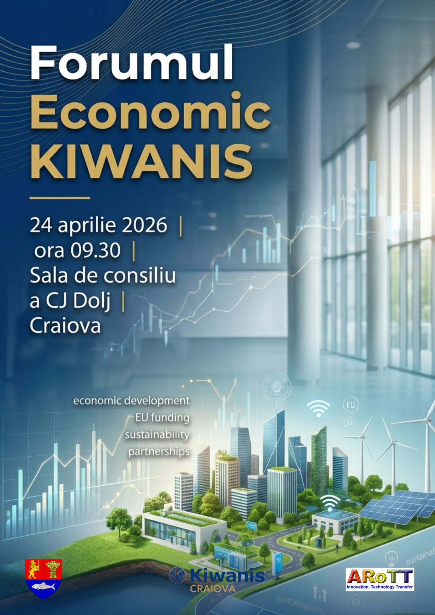 Kiwanis Craiova organizează, în parteneriat cu Consiliul Județean Dolj și Asociația Română de Transfer Tehnologic și Inovare, Forumul Economic Kiwanis, un eveniment dedicat dezvoltării economice regionale și consolidării colaborării între sectoare. Manifestarea va avea loc vineri, 24 aprilie, la sediul Consiliului Județean Dolj, începând cu ora 9.30.